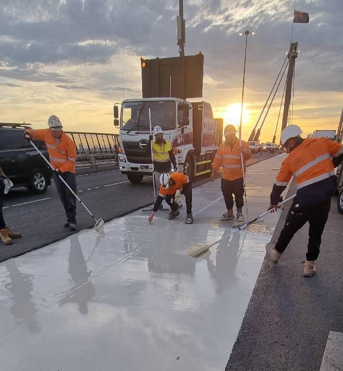 Since 2019, CRL has been engaged annually to apply the Matacryl WPM waterproofing system to the Westgate Bridge steel deck. These works are carefully scheduled during a narrow shutdown window between Christmas and New Year to minimise traffic disruption. The initial scope began with approximately1,000 m² in 2019 and has since expanded to cover around 2,800 m² per year, typically encompassing a full lane width between expansion joints.